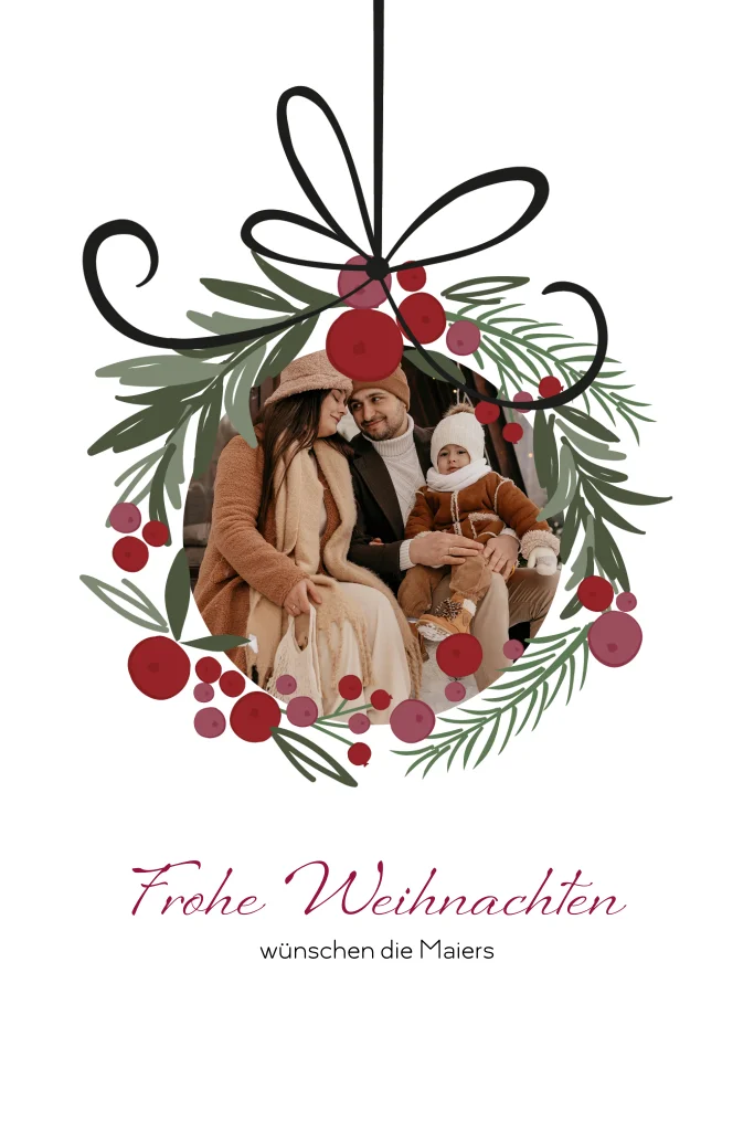 Überraschen Sie Familie, Freunde oder Geschäftspartner mit einer exklusiven Weihnachtskarte im schlichten Design. Der Beerenkranz auf der Vorderseite sorgt für festliche Stimmung und unterstreicht Ihre Wertschätzung zum Weihnachtsfest.