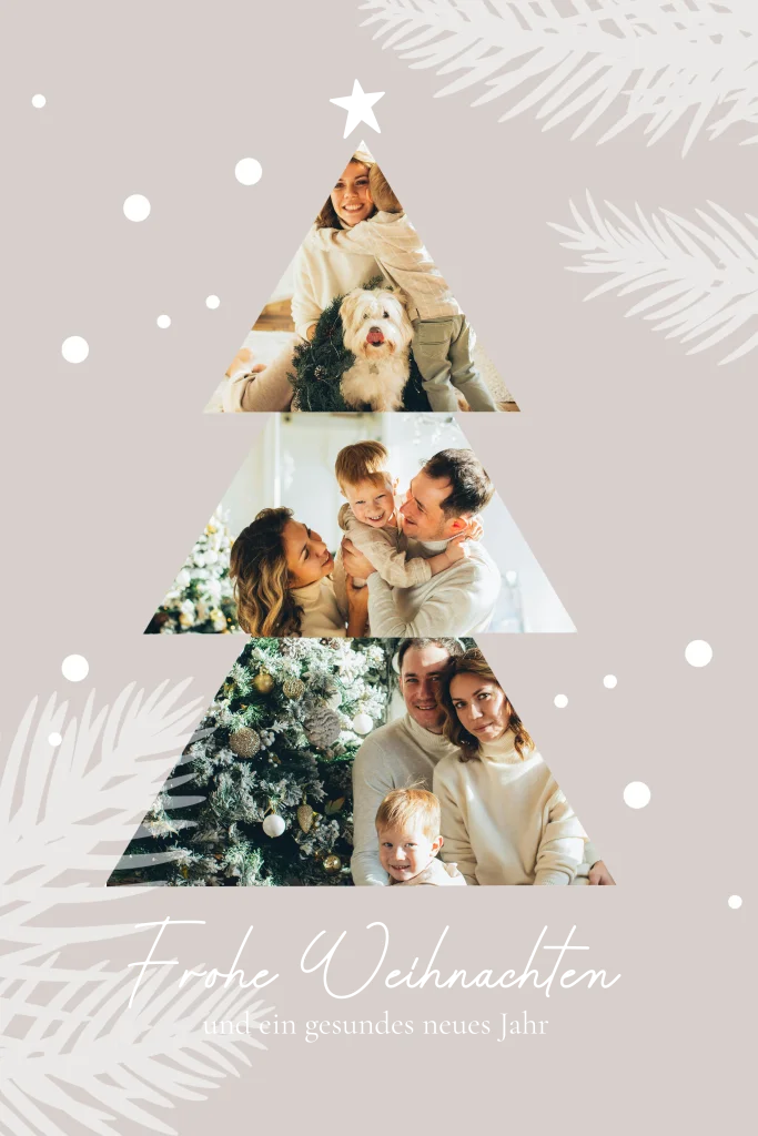 Überraschen Sie Familie, Freunde oder Geschäftspartner mit einer exklusiven Weihnachtskarte im schlichten Design. Die Fotocollage in Form eines Tannenbaums auf der Vorderseite sorgt für festliche Stimmung und unterstreicht Ihre Wertschätzung zum Weihnachtsfest.