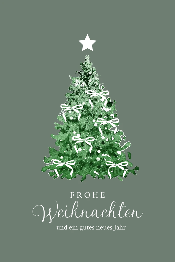 Überraschen Sie Familie, Freunde oder Geschäftspartner mit einer exklusiven Weihnachtskarte im grünen Design. Der festlich geschmückte Weihnachtsbaum auf der Vorderseite sorgt für festliche Stimmung und unterstreicht Ihre Wertschätzung zum Weihnachtsfest.