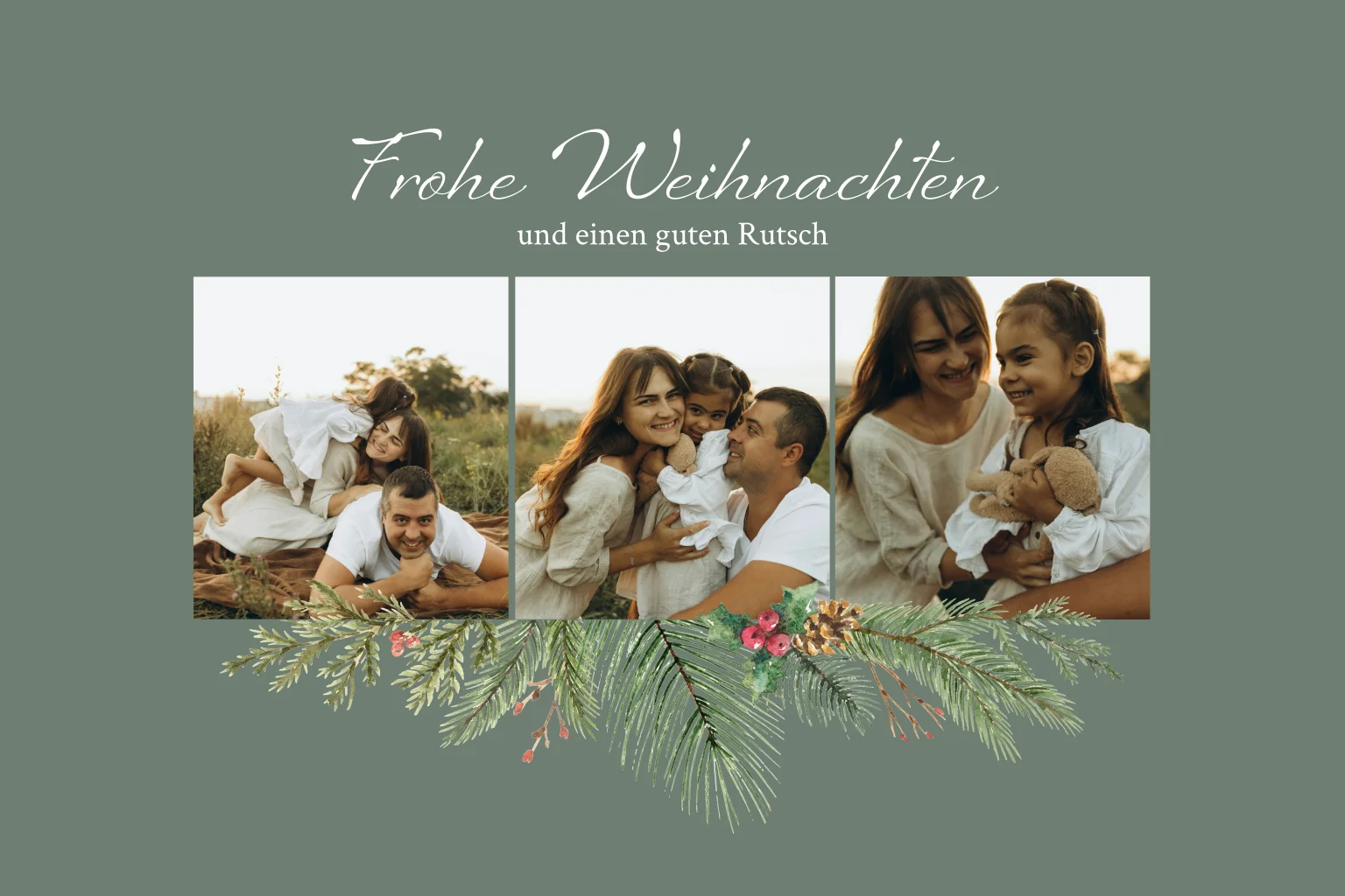 Überraschen Sie Familie, Freunde oder Geschäftspartner mit einer exklusiven Weihnachtskarte im grünen Design. Die Fotocollage mit Weihnachtszweigen auf der Vorderseite sorgt für festliche Stimmung und unterstreicht Ihre Wertschätzung zum Weihnachtsfest.