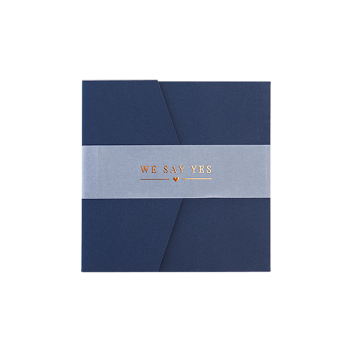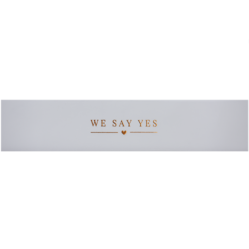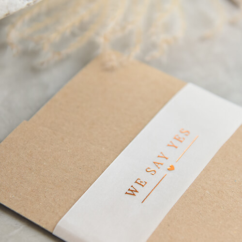 Bellyband van kalkpapier met koperfolie tekst we say yes. Gaaf om een pocketfold of om een set kaarten. Gemakkelijk vast te maken met een mooie sluitzegel.