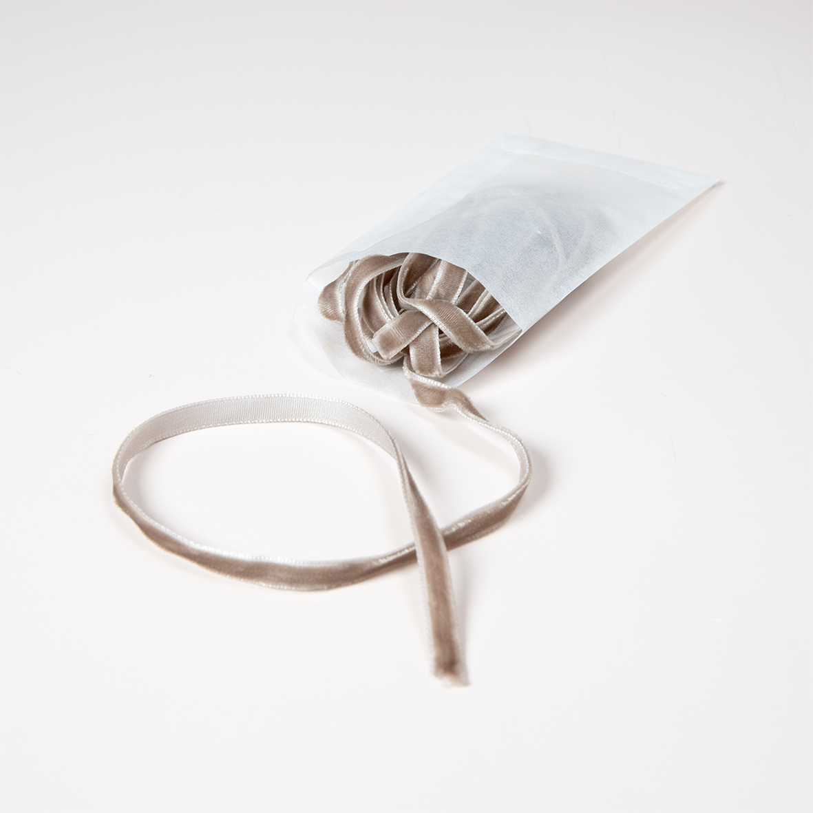 Taupe fluweel lint (10 meter) van 6 mm breed. Het fluweel zit aan één zijde van het lint. Geschikt om ca. 25 kaarten mee te versieren.