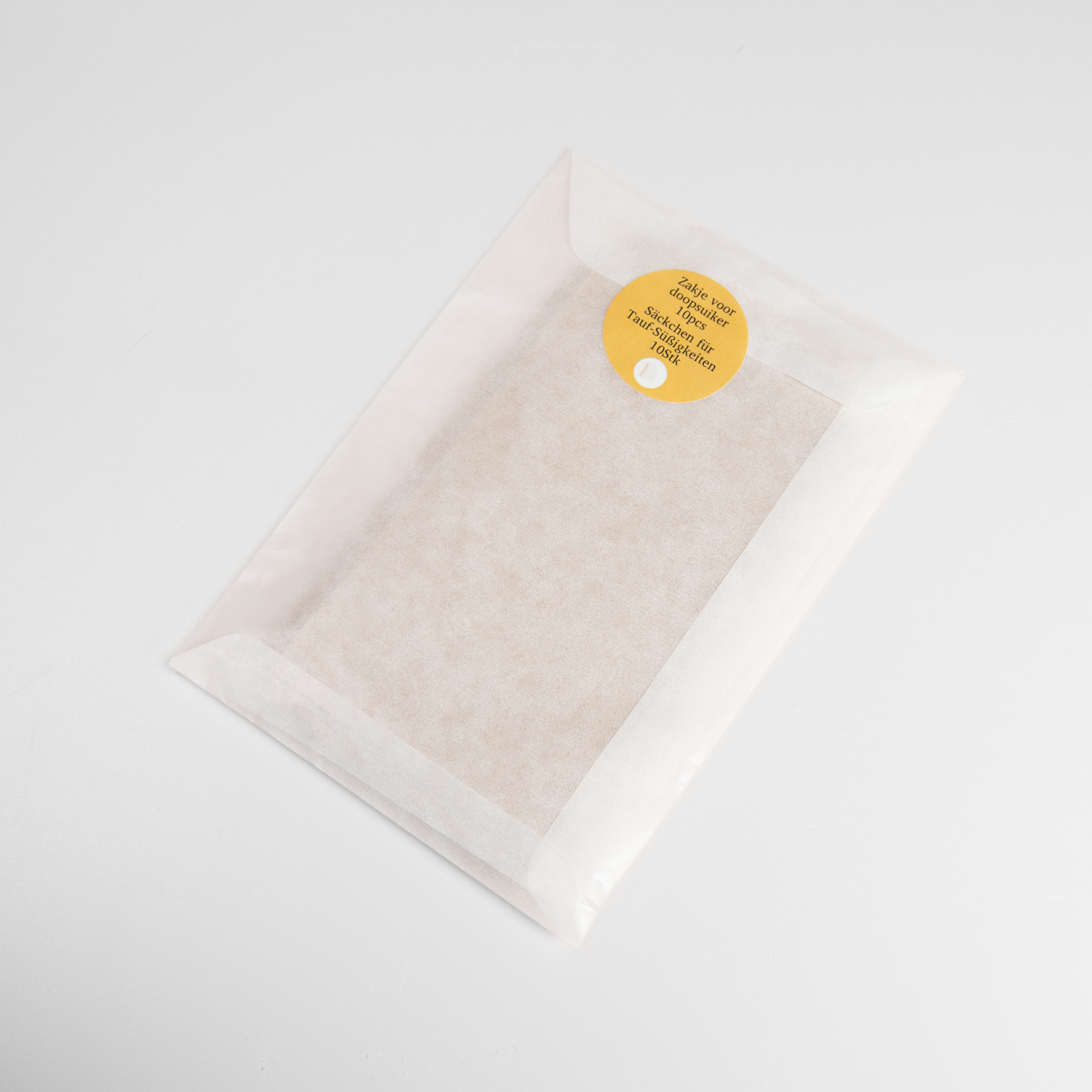 Hip kraft zakje dat je kunt sluiten met een sticker. Goed te gebruiken als doopsuiker, als bedankje na communie of huwelijk of als snoepzakje na een kinderfeestje. Het zakje is 17 cm hoog en 10,5 cm breed en wordt leeg geleverd.