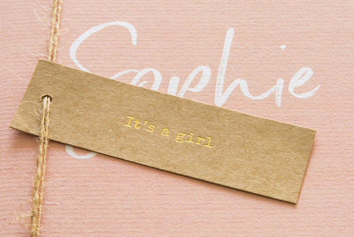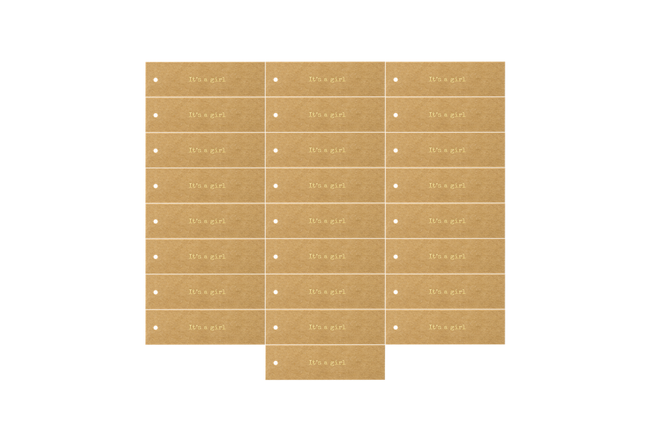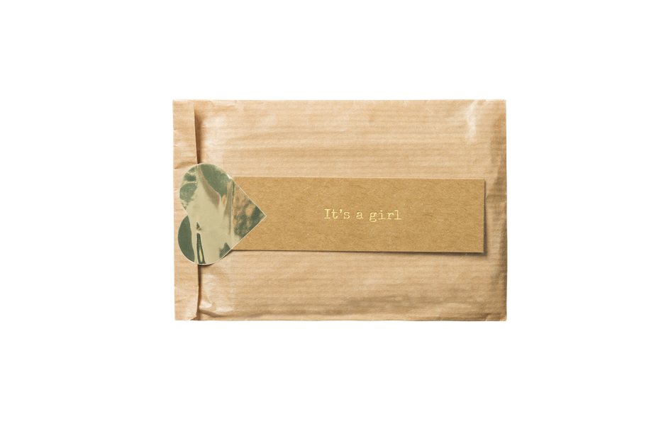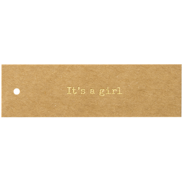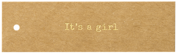 Hip kraftlabeltje met de tekst It's a girl in goudkleurige letters
