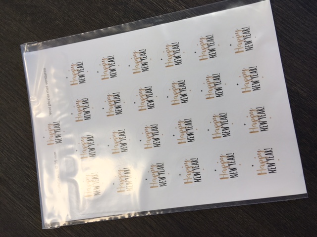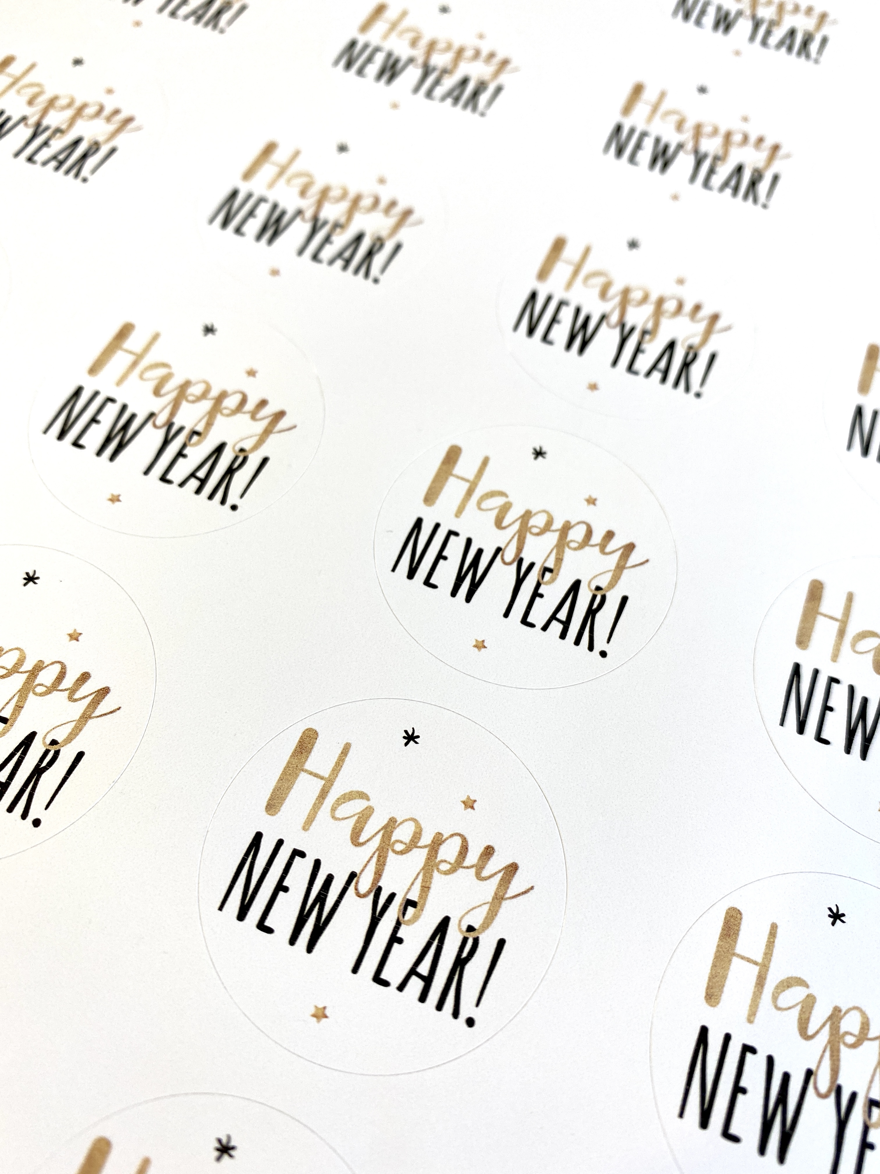 Hier, bitte sehr! Du kannst jetzt 75 kostenlose Weihnachtsaufkleber mit dem Text "Happy New Year" auswählen, um deine Umschläge zu verzieren.
