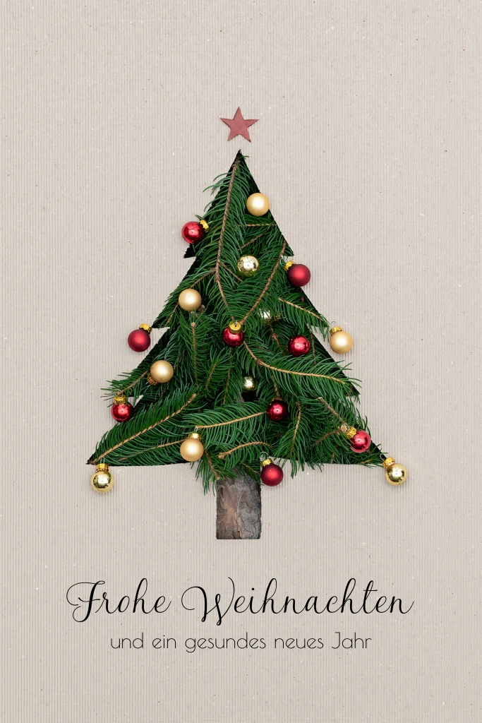 Stilvolle Weihnachtskarte mit Tannenbaum in Rot-Gold.